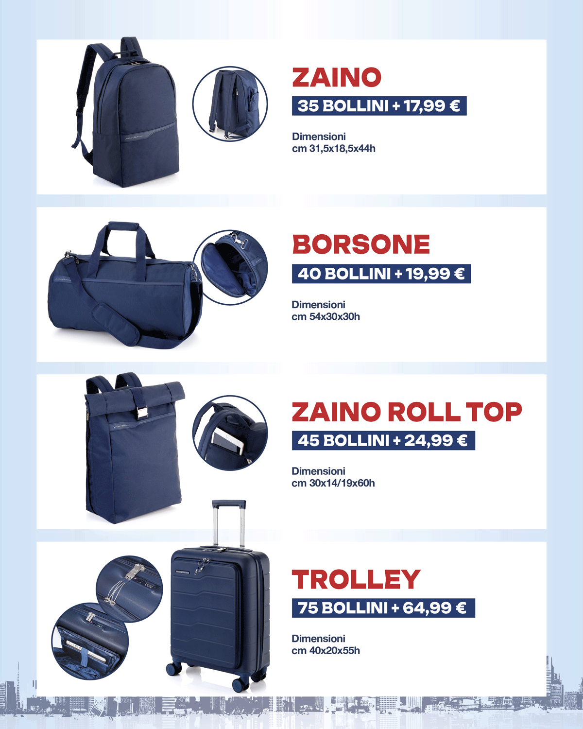 Tra i premi ti aspettano trolley, zaini, borsoni, beauty case, ombrello e altri accessori. Sono tutti realizzati in tessuto riciclato 100% RPET, per coniugare stile, praticità e rispetto dell’ambiente.
