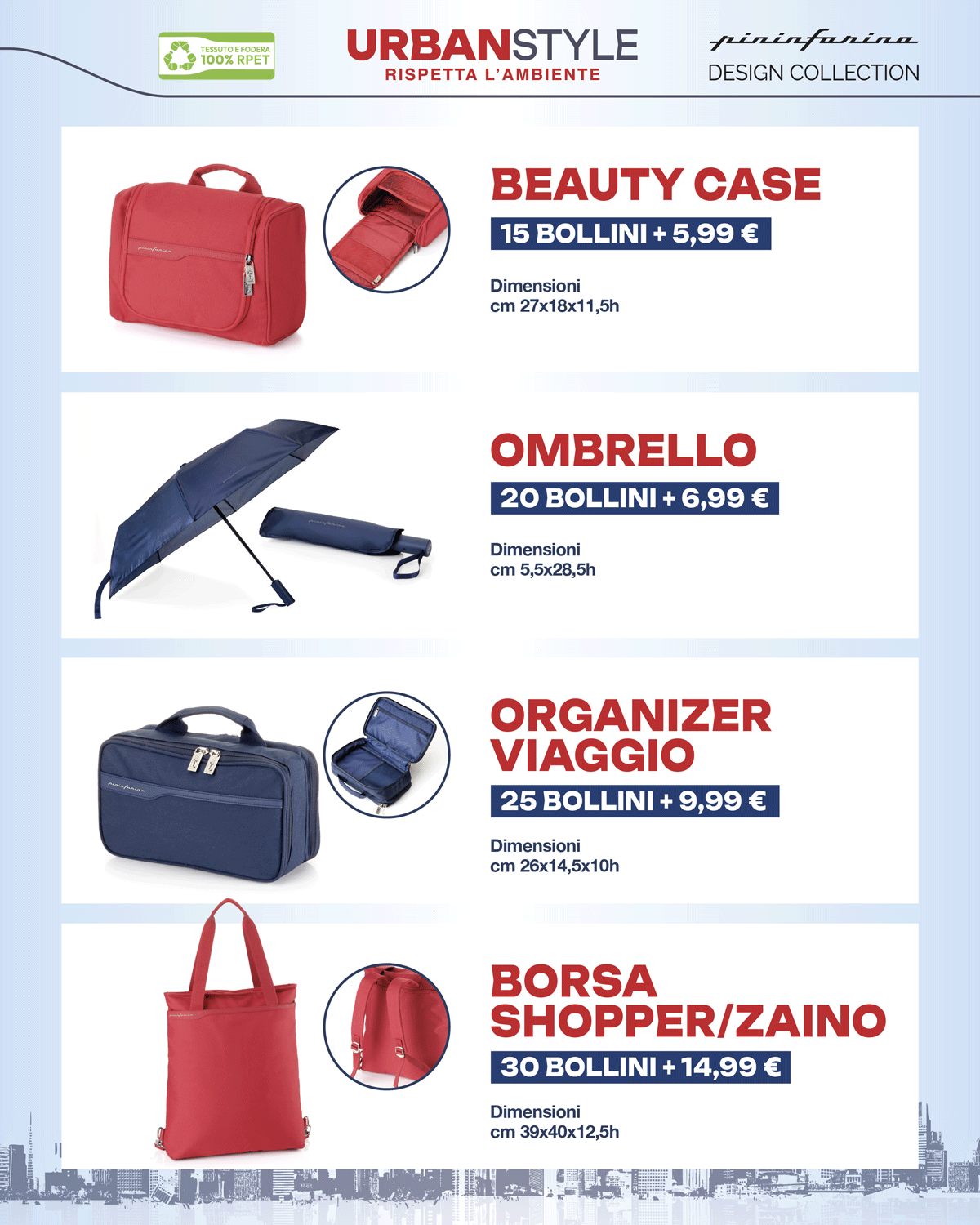 Dal 20 ottobre 2025 al 25 gennaio 2026*, ogni 15 € di spesa (scontrino unico, multipli inclusi) riceverai 1 bollino. Raccoglili sulla tessera e scegli il tuo premio Urban Style firmato Pininfarina, da ritirare aggiungendo un piccolo contributo.